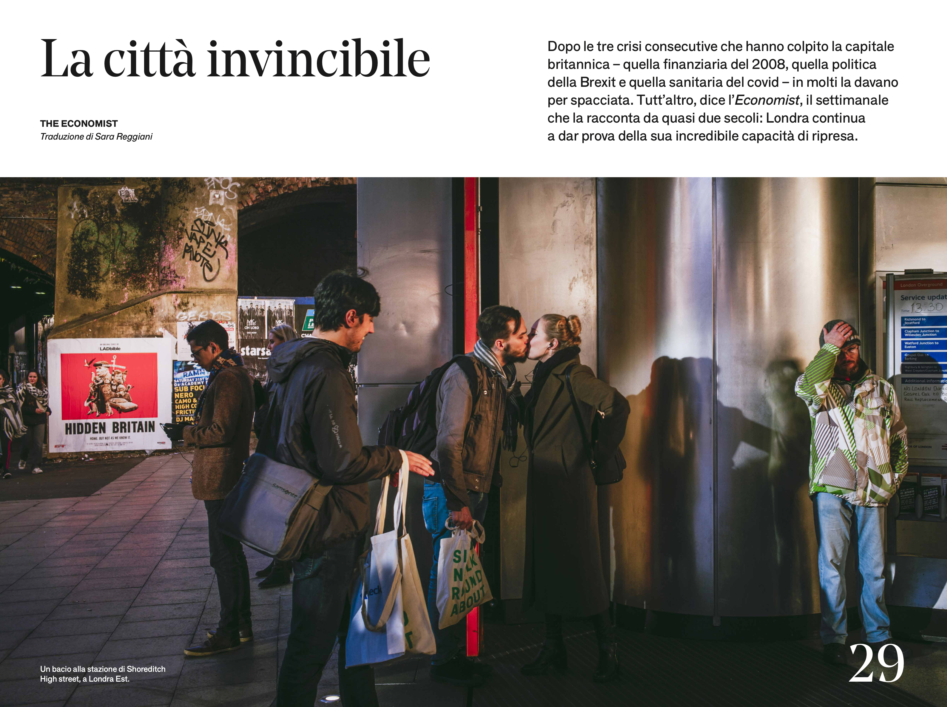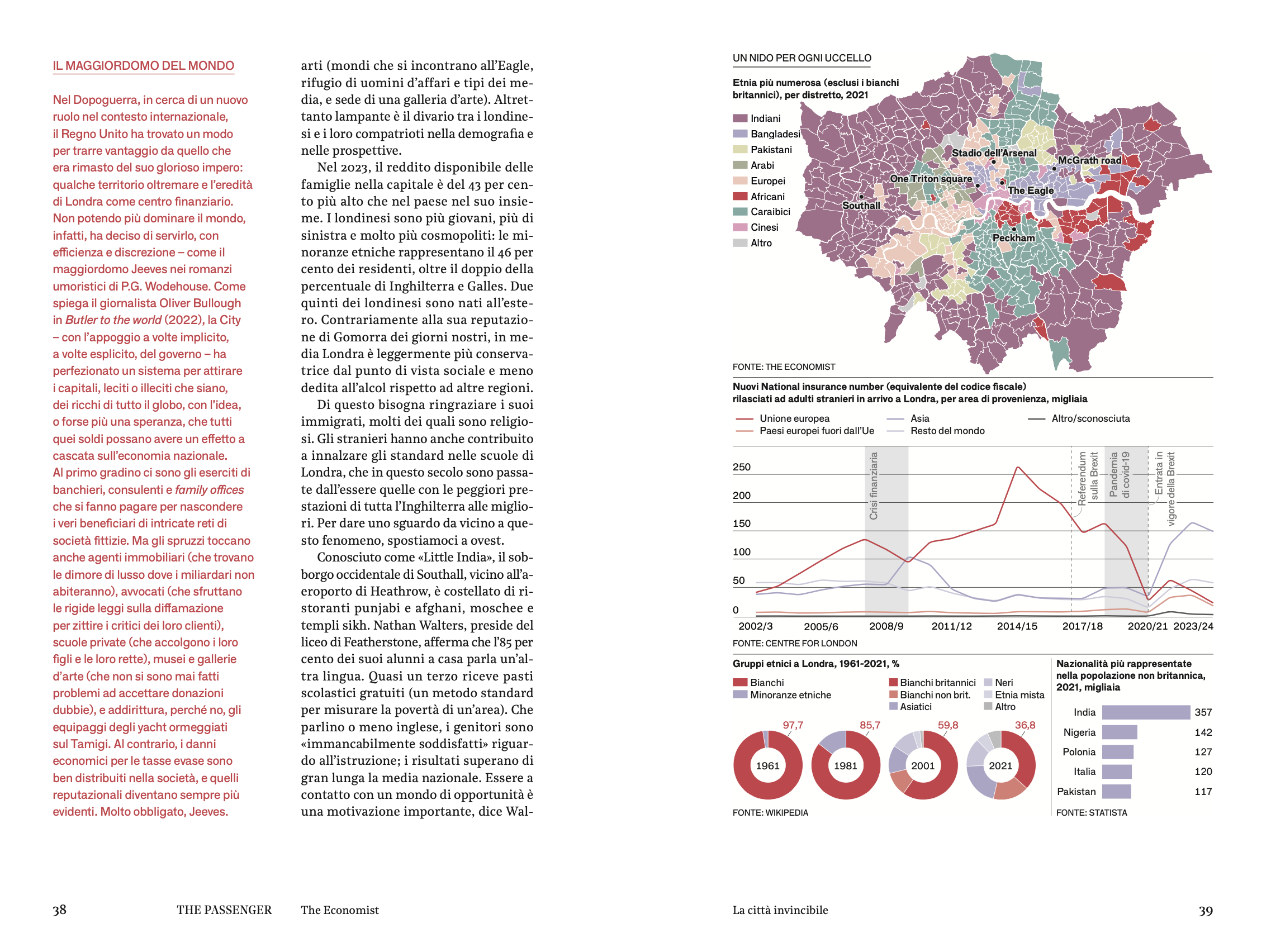Londra città aperta. È la sua forza e la sua maledizione. Aperta e cosmopolita, con una popolazione multietnica che la connette ai quattro angoli del pianeta; aperta agli affari e all’Europa, come insistono i suoi sindaci pre e post Brexit; e aperta ai flussi della finanza globale e agli investimenti immobiliari di miliardari felici di parcheggiare i loro soldi in una grande metropoli di lingua inglese, dove lo stato di diritto e leggi clementi garantiscono loro anonimato e sicurezza – per non parlare del glamour. E così le case più esclusive della città finiscono in mano a superricchi stranieri, i «solo» ricchi si accontentano di un gradino più basso, subentrando ai benestanti e spingendo sempre più in fuori tutti gli altri, in una reazione a catena che inasprisce una drammatica crisi abitativa dovuta alla carenza di alloggi: da decenni Londra attira nuovi abitanti, ma non costruisce le case per ospitarli. Il caro-affitti strangola non solo la popolazione a basso reddito, ma anche tutto quello che rendeva la città una vera capitale: gallerie, teatri, locali, ristoranti. E poi ci sono gli choc esterni, il triplice colpo di crisi finanziaria, Brexit e pandemia che avrebbe abbattuto qualsiasi città, ma che per Londra, centro di scambi e commerci, punto di incontro dell’umanità, è stato un affronto personale, ad civitatem. Eppure Londra sopravvive e, in angoli inaspettati della sua vastità, lontano dal richiamo turistico di Buckingham palace, fiorisce: nelle comunità sudasiatiche a due passi da Heathrow, dove seconde, terze generazioni creano generi musicali che diventano globali; nei campi di calcio della Londra Sud nigeriana, dove crescono i talenti della nazionale inglese; nelle gallerie che nascono in zone periferiche, dove artisti un tempo poco considerati vengono riscoperti e rivalutati; nei ristoranti fuori dai confini porosi del centro, dove mescolanze e combinazioni inedite vengono testate prima di diventare nuove tendenze. E nell’eterna girandola di quartieri che si atrofizzano di gentrificazione (una parola, se non un fenomeno, inventata a Londra per Londra) e altri che diventano insospettabili centri di creatività, Londra respinge e accoglie, cambia e si trasforma. E, fedele a se stessa, rimane aperta.
